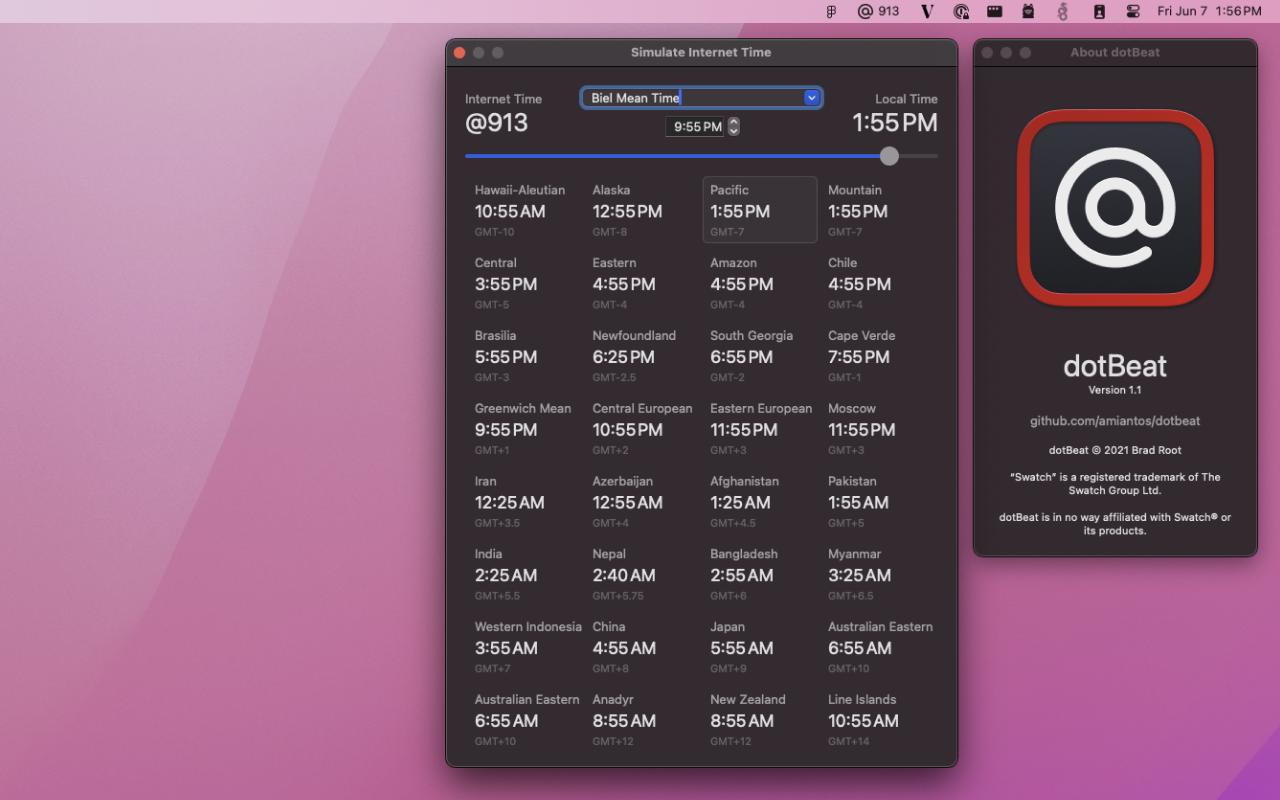 dotBeat gives you Swatch Internet Time right in your macOS menu bar! But, that's not all, it also has an interesting UX for viewing most timezones on earth, for when you're planning global meetings. |