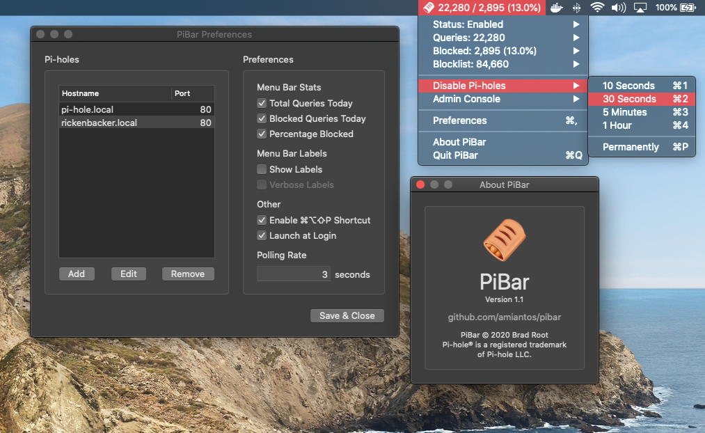 PiBar is a macOS menu bar app for managing your Pi-hole(s). Compatible with macOS 10.12 (and later). Download for free via |